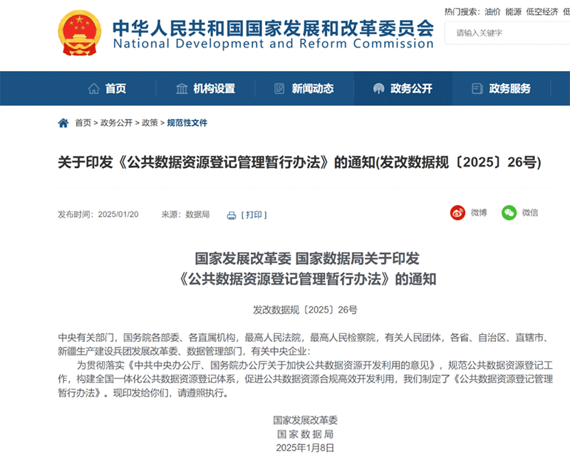 國(guó)家發(fā)展改革委 國(guó)家數(shù)據(jù)局關(guān)于印發(fā)《公共數(shù)據(jù)資源登記管理暫行辦法》的通知