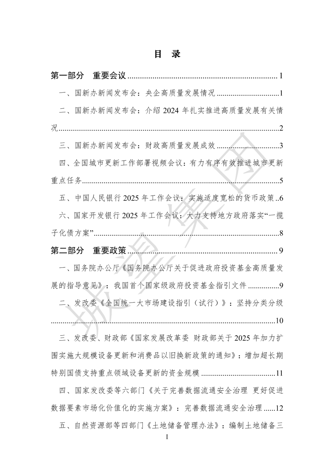 1月20日,全國城市更新工作部署視頻會議20日在京召開,中共中央政治局委員、國務(wù)院副總理何立峰出席會議并講話。何立峰強(qiáng)調(diào),要認(rèn)真學(xué)習(xí)深刻領(lǐng)會習(xí)近平總書記重要講話精神,著力貫徹落實(shí)黨的二十大和二十屆三中全會、中央經(jīng)濟(jì)工作會議部署,認(rèn)真落實(shí)國務(wù)院常務(wù)會議要求,進(jìn)一步認(rèn)識實(shí)施城市更新對于城市發(fā)展模式轉(zhuǎn)型、助力經(jīng)濟(jì)高質(zhì)量發(fā)展、滿足人民群眾需要的重大意義,堅(jiān)持目標(biāo)導(dǎo)向和問題導(dǎo)向,有力有序有效推進(jìn)城市更新重點(diǎn)任務(wù)。要落實(shí)項(xiàng)目資金平衡責(zé)任,按照市場化、法治化原則,統(tǒng)籌利用各方面資金資源,構(gòu)建好政府、市場與住戶之間的資金共擔(dān)機(jī)制。要堅(jiān)持不動則已、動則必快、動則必成,按期高質(zhì)量完成項(xiàng)目建設(shè),確保把好事辦好、實(shí)事辦實(shí)。要加強(qiáng)組織保障,城市政府應(yīng)切實(shí)承擔(dān)好主體責(zé)任,精心謀劃組織,務(wù)實(shí)推進(jìn)城市更新項(xiàng)目實(shí)施,確保工程質(zhì)量安全,中央有關(guān)部門要加強(qiáng)政策支持,共同推動城市更新工作取得實(shí)效。一、國務(wù)院辦公廳《國務(wù)院辦公廳關(guān)于促進(jìn)政府投資基金高質(zhì)量發(fā)展的指導(dǎo)意見》:我國首個(gè)國家級政府投資基金指引文件