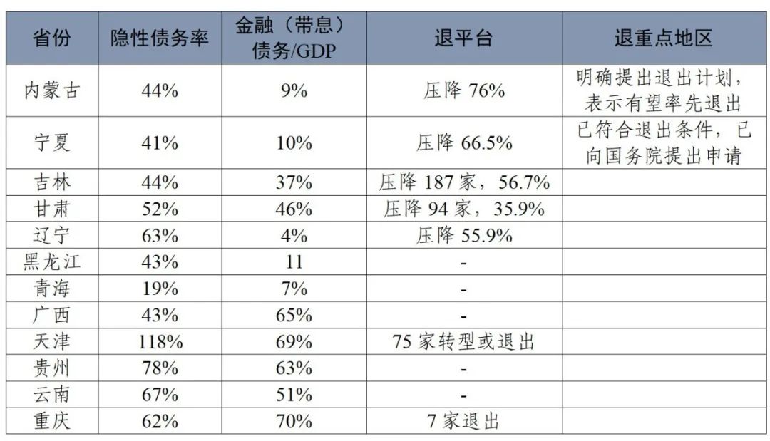 綜合來看,退出重點省份的順序或為:第一批寧夏、內(nèi)蒙古、吉林、遼寧、青海、甘肅、黑龍江;第二批重慶、天津;第三批廣西、云南、貴州。結(jié)合隱債化解完成的時間來看,各地有望在2028年之前陸續(xù)完成重點省份序列的退出。