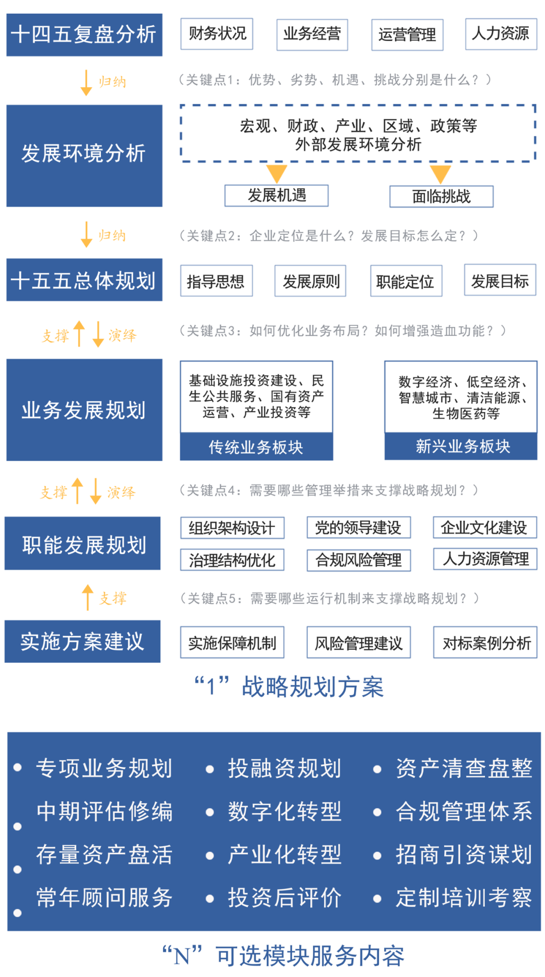 關(guān)鍵2:企業(yè)定位是什么?發(fā)展目標(biāo)怎么定?關(guān)鍵3:如何優(yōu)化業(yè)務(wù)布局?如何增強造血功能?關(guān)鍵4:需要哪些管理舉措來支撐戰(zhàn)略規(guī)劃?關(guān)鍵5:需要哪些運行機制來支撐戰(zhàn)略規(guī)劃?面向“十五五”,城望以“變局識勢、謀局定向、破局攻堅”構(gòu)建高質(zhì)量發(fā)展戰(zhàn)略體系,賦能國資國企提質(zhì)效、抓創(chuàng)新、促改革、調(diào)結(jié)構(gòu),為國資國企在“十五五”期間高質(zhì)量發(fā)展夯實基礎(chǔ)。為提供更精準(zhǔn)高效的服務(wù),城望集團在編制“十五五”規(guī)劃定向服務(wù)的基礎(chǔ)上升級構(gòu)建“1+N”服務(wù)體系,圍繞“十五五”規(guī)劃中重點業(yè)務(wù)中期修編、數(shù)字化轉(zhuǎn)型等“N”個可細(xì)化、可拓展維度,提供定制化的專項服務(wù)內(nèi)容,通過服務(wù)向下延伸,有效推動企業(yè)持續(xù)向上發(fā)展。完整版《變局·謀局·破局——“十五五”規(guī)劃編制全景指南》包括“十五五”面臨的新形勢、規(guī)劃編制重點內(nèi)容、“1+N”服務(wù)體系、服務(wù)特色和案例等內(nèi)容。