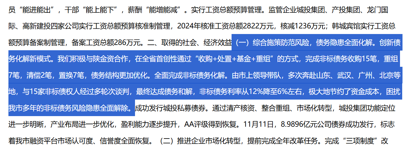 根據(jù)韓城市人民政府國有資產(chǎn)監(jiān)督管理委員會近期發(fā)布的年度報告,韓城市在2024年綜合施策防范風(fēng)險,債務(wù)隱患全面化解。