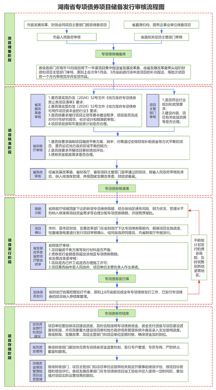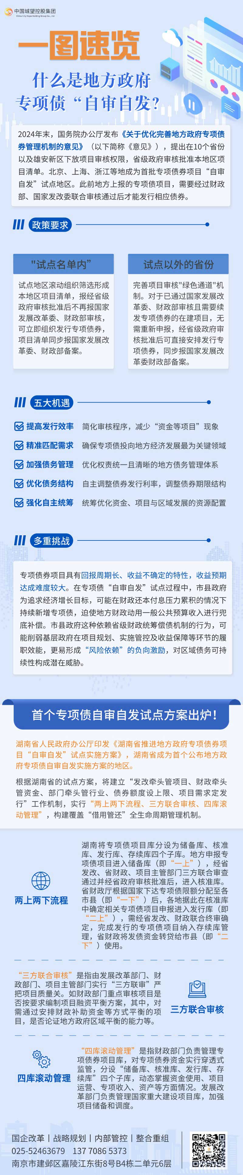 2024年12月,國務院辦公廳印發(fā)《關于優(yōu)化完善地方政府專項債券管理機制的意見》。其中提出,開展專項債券項目“自審自發(fā)”試點,在北京市、上海市、江蘇省、浙江?。ê瑢幉ㄊ校?、安徽省、福建?。ê瑥B門市)、山東?。ê鄭u市)、湖南省、廣東省(含深圳市)、四川省10個省份以及雄安新區(qū)下放項目審核權(quán)限,省級政府審核批準本地區(qū)項目清單。今年3月,湖南省成為首個公開發(fā)布地方政府專項債券自審自發(fā)實施方案的地區(qū)。