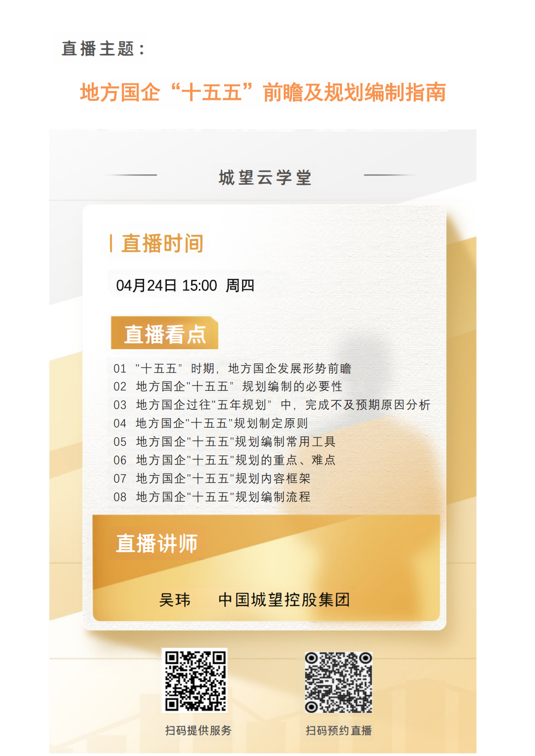 為深入貫徹落實黨中央、國務院關于國有企業(yè)改革發(fā)展的決策部署,指導和幫助地方國企高質量編制“十五五”規(guī)劃。為此,我們特別推出了《地方國企“十五五”前瞻及規(guī)劃編制指南》主題直播分享。