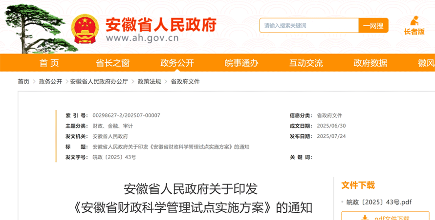 在試點目標上,安徽將用2025-2026兩年時間開展試點工作,2025年,取得階段性成效;2026年,系統(tǒng)總結(jié)經(jīng)驗,優(yōu)化完善措施,基本完成試點任務(wù),全面提升財政管理的系統(tǒng)化、精細化、標準化和法治化水平,以財政科學(xué)管理推動政府治理效能提升。