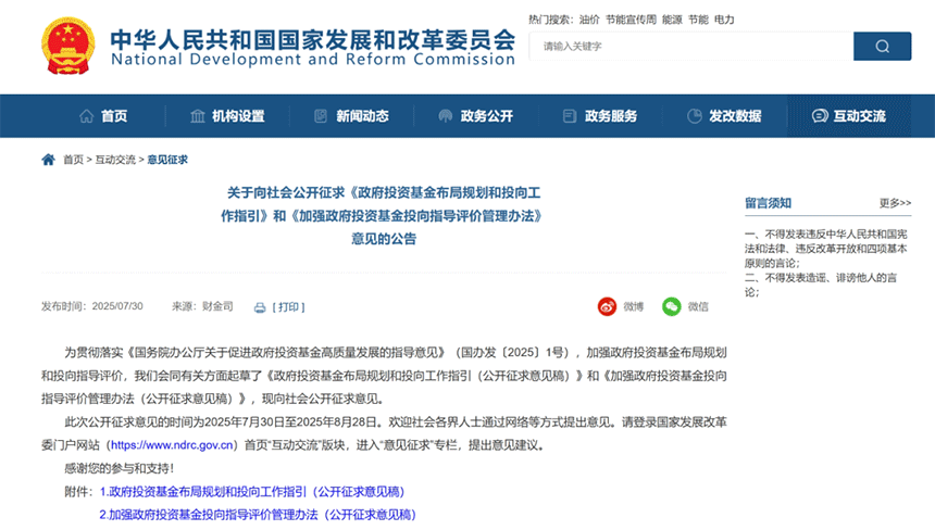 7月30日,國(guó)家發(fā)改委向社會(huì)公開征求《政府投資基金布局規(guī)劃和投向工作指引》和《加強(qiáng)政府投資基金投向指導(dǎo)評(píng)價(jià)管理辦法》意見。其中,《政府投資基金布局規(guī)劃和投向工作指引公開征求意見稿》提到,國(guó)家級(jí)基金要立足全局、抓大放小,重點(diǎn)支持國(guó)家層面現(xiàn)代化產(chǎn)業(yè)提質(zhì)升級(jí)、關(guān)鍵核心技術(shù)攻關(guān)和跨區(qū)域重大項(xiàng)目建設(shè),補(bǔ)齊產(chǎn)業(yè)發(fā)展短板,突破產(chǎn)業(yè)基礎(chǔ)瓶頸,聚焦少數(shù)關(guān)鍵領(lǐng)域發(fā)揮示范引領(lǐng)作用。鼓勵(lì)國(guó)家級(jí)基金加強(qiáng)與地方基金聯(lián)動(dòng),在前沿科技領(lǐng)域和產(chǎn)業(yè)鏈關(guān)鍵環(huán)節(jié),結(jié)合地方資源稟賦,通過(guò)聯(lián)合設(shè)立子基金或?qū)Φ胤交鸪鲑Y等方式,形成資金合力。