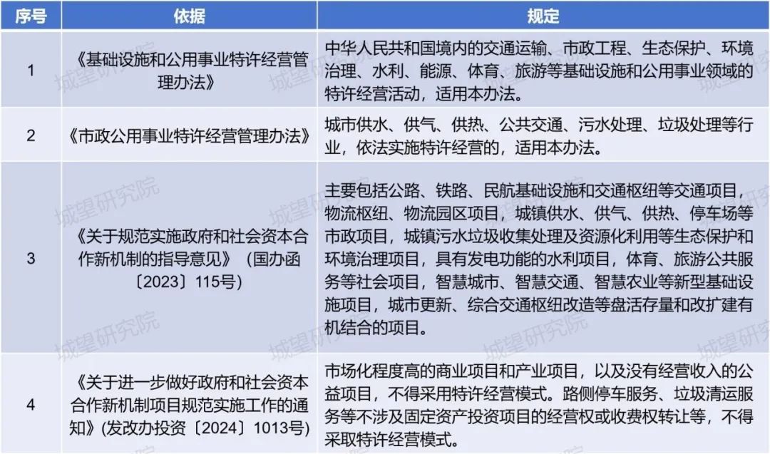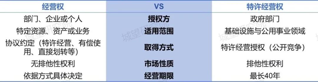 01 辨析:經(jīng)營權 VS 特許經(jīng)營權 《基礎設施和公用事業(yè)特許經(jīng)營管理辦法》(2024年第17號令)僅對特許經(jīng)營模式做了定義,對特許經(jīng)營權可以拓展理解為由特定授權主體(通常為政府部門或其授權機構)依法授予企業(yè)或其他組織在一定期限、一定區(qū)域內(nèi),從事特定公共基礎設施建設、公用事業(yè)運營并獲得收益的專有權利。 02 匹配:哪些經(jīng)營權適用特許經(jīng)營模式?
