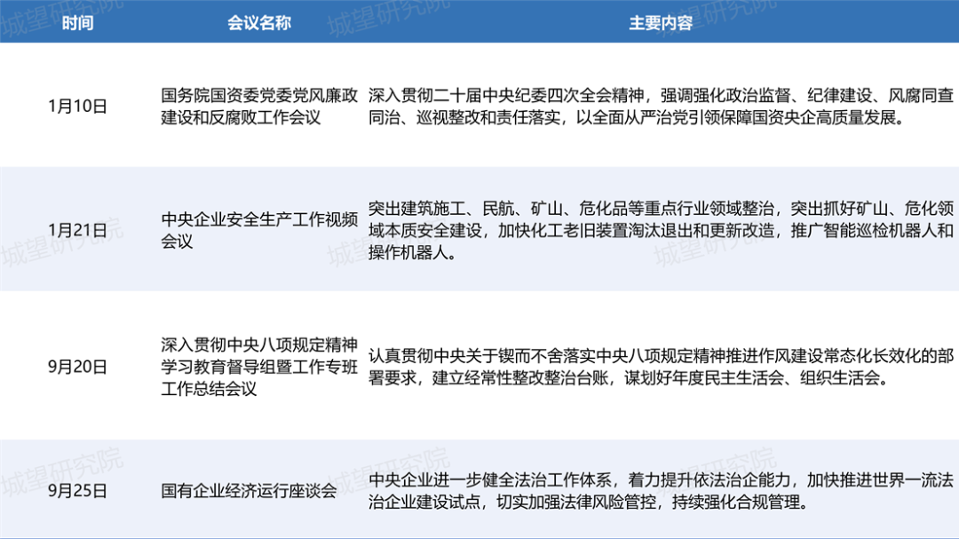 從2025年經(jīng)濟(jì)運(yùn)行與安全生產(chǎn)系列會(huì)議來(lái)看,以全面從嚴(yán)治黨引領(lǐng)保障國(guó)資央企高質(zhì)量發(fā)展,要求積極統(tǒng)籌發(fā)展與安全,強(qiáng)化重點(diǎn)領(lǐng)域風(fēng)險(xiǎn)排查,持續(xù)強(qiáng)化合規(guī)管理。