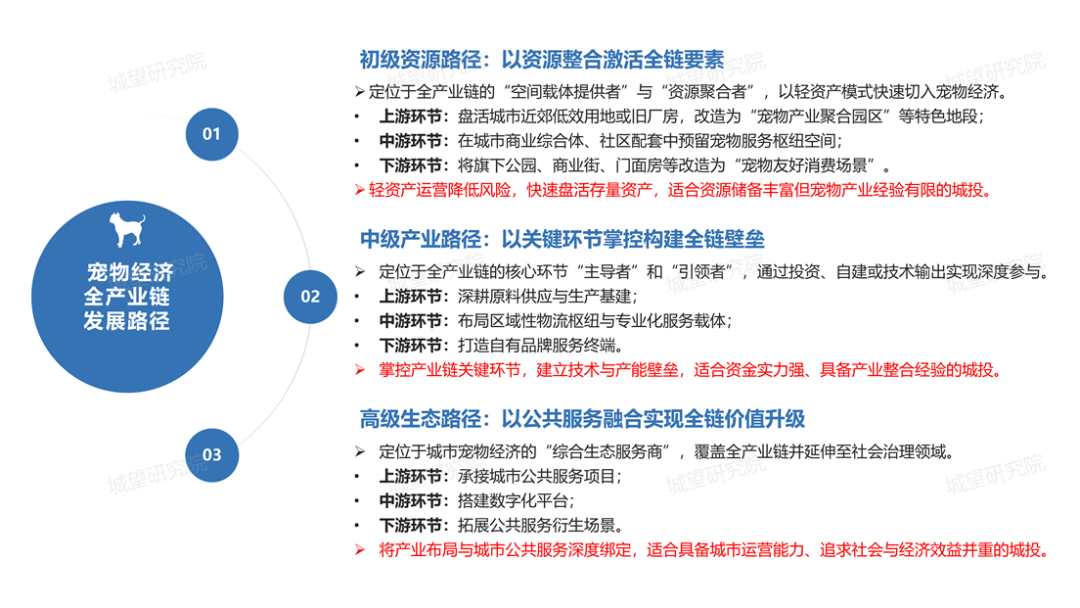 城投布局寵物經(jīng)濟(jì)全產(chǎn)業(yè)鏈,需根據(jù)自身資源稟賦與發(fā)展目標(biāo)選擇路徑:資源賦能型適合以存量資產(chǎn)激活產(chǎn)業(yè)初期生態(tài),產(chǎn)業(yè)鏈嵌入型適合以關(guān)鍵環(huán)節(jié)掌控建立競(jìng)爭(zhēng)壁壘,城市生態(tài)構(gòu)建型適合以公共服務(wù)融合實(shí)現(xiàn)價(jià)值升級(jí)。三者并非遞進(jìn)替代關(guān)系,可根據(jù)區(qū)域產(chǎn)業(yè)基礎(chǔ)與企業(yè)定位靈活組合,最終通過(guò)全產(chǎn)業(yè)鏈布局推動(dòng)寵物經(jīng)濟(jì)從“規(guī)模擴(kuò)張”向“高質(zhì)量發(fā)展”轉(zhuǎn)型,同時(shí)在“十五五”時(shí)期實(shí)現(xiàn)自身業(yè)務(wù)的戰(zhàn)略延伸。