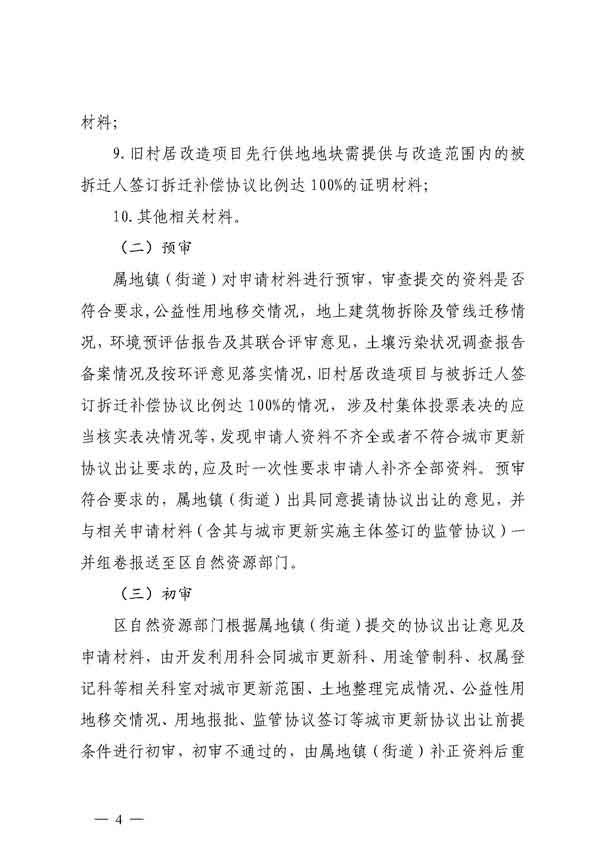 為規(guī)范城市更新改造中為規(guī)范城市更新改造中協(xié)議出讓國有建設用地行為,2021年8月31日,佛山市自然資源局禪城分局發(fā)布關于印發(fā)《城市更新國有建設用地協(xié)議出讓操作指引》(以下簡稱“指引”)的函,明確城市更新國有建設用地協(xié)議出讓程序?!吨敢访鞔_城市更新項目辦理協(xié)議出讓必須滿足五項前期條件,包括取得城市更新單元計劃批復;已完成按城市更新政策要求比例的被拆遷人簽訂拆遷補償協(xié)議;凈用地范圍內(nèi)涉及集體土地性質(zhì)的,應當完成國有建設用地土地手續(xù)等等。從協(xié)議出讓程序來看(如下圖所示),大致分為申請、預審、初審、受理、擬定出讓方案、政府審批、合同簽訂等七大階段,其中在申請階段,舊村居改造項目先行供地地塊,需提供與改造范圍內(nèi)的被拆遷人簽訂拆遷補償協(xié)議比例達100%的證明材料。